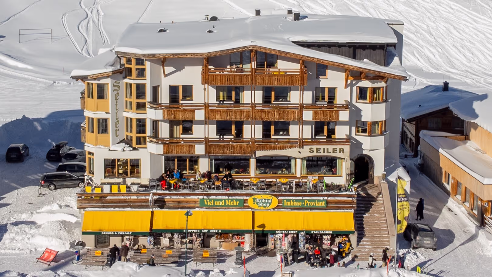 Beste Lage für unvergessliche Wintertage – ruhig und zentral im Herzen von Kühtai. Auch der Treffpunkt der Skischule befindet sich direkt hinter dem Hotel.